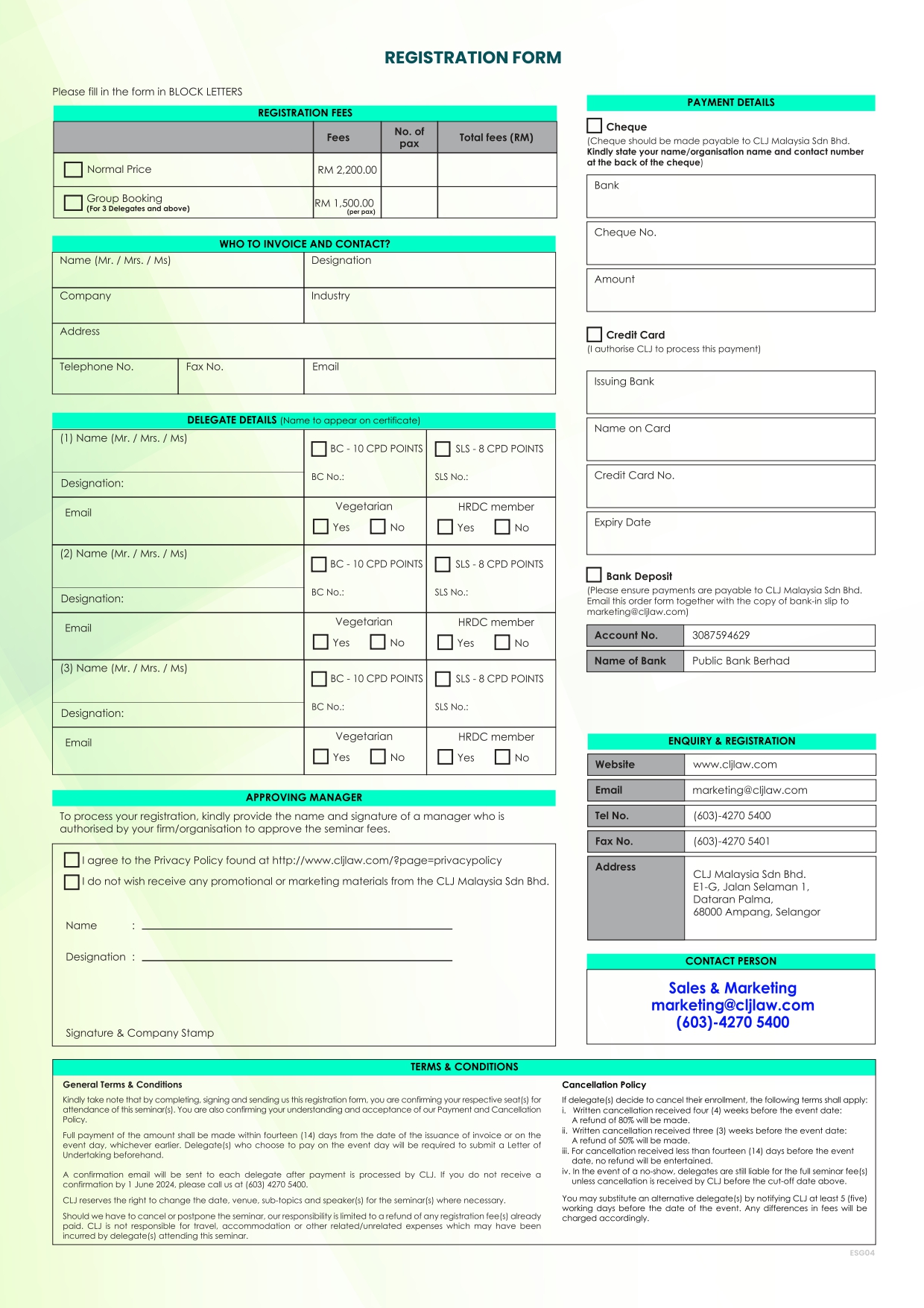 Should we have to cancel or postpone the seminar, our responsibility is limited to a refund of any registration fee(s) already paid. CLJ is not responsible for travel, accommodation or other related/unrelated expenses which may have been incurred by delegate(s) attending this seminar.
