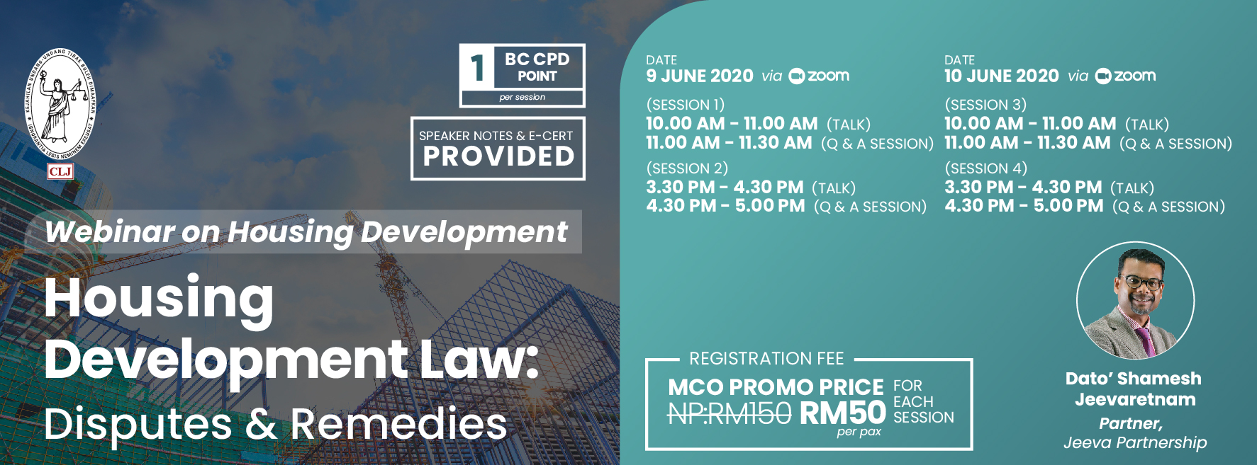 Issues relating to housing development matters is governed by rules of procedure which are intricate and labyrinthine in nature. For those involved in this area of practice may see it as a daunting task that oftentimes requires a herculean effort on their part. The objective of this specialist webinar series is to discuss, among others, on the salient provisions under the Housing Development Act 1966, handling dispute resolutions between purchasers and developers, Management Corporations and defect claims. That aside, the speaker will also highlight about the new norm in resolving disputes between parties.