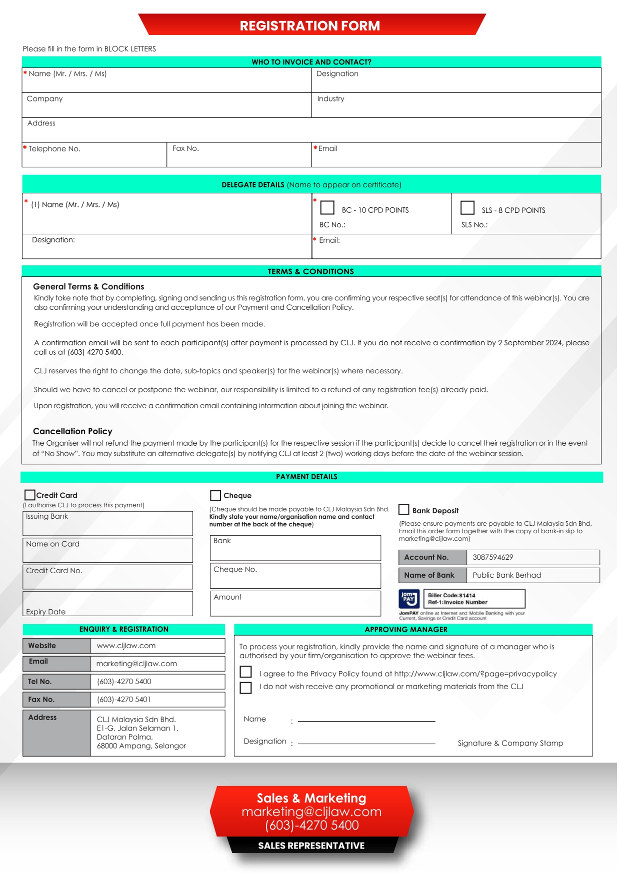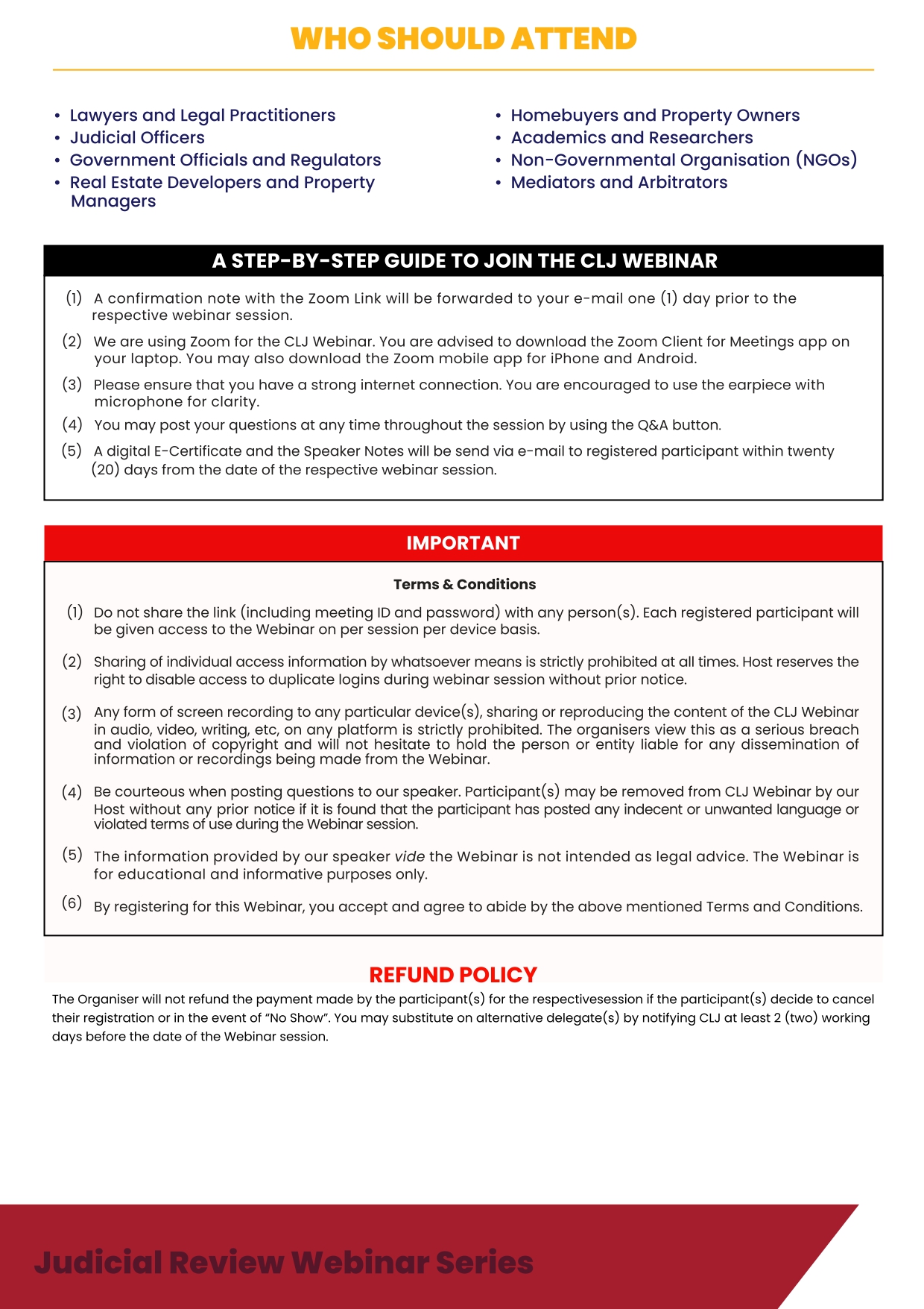 You may substitute on alternative delegate(s) by notifying CLJ at least 2 (two) working days before the date of the Webinar session.
