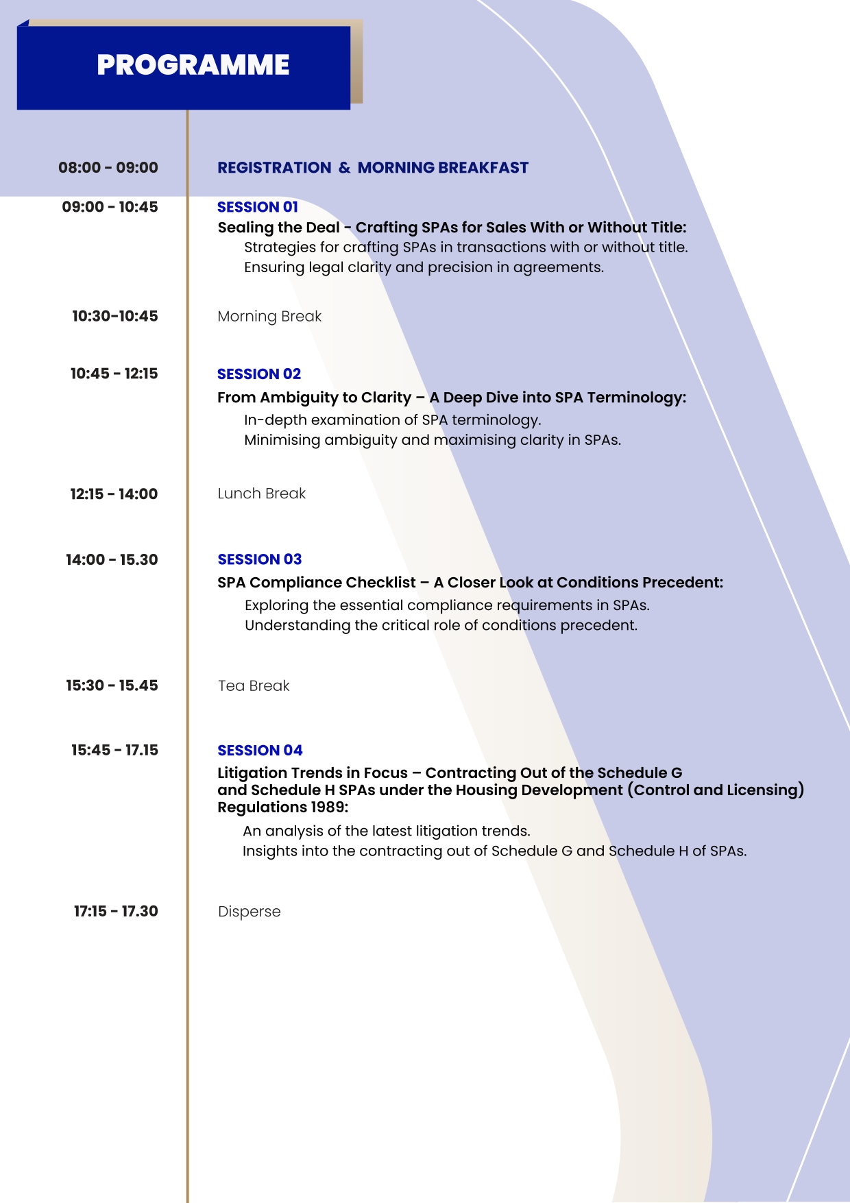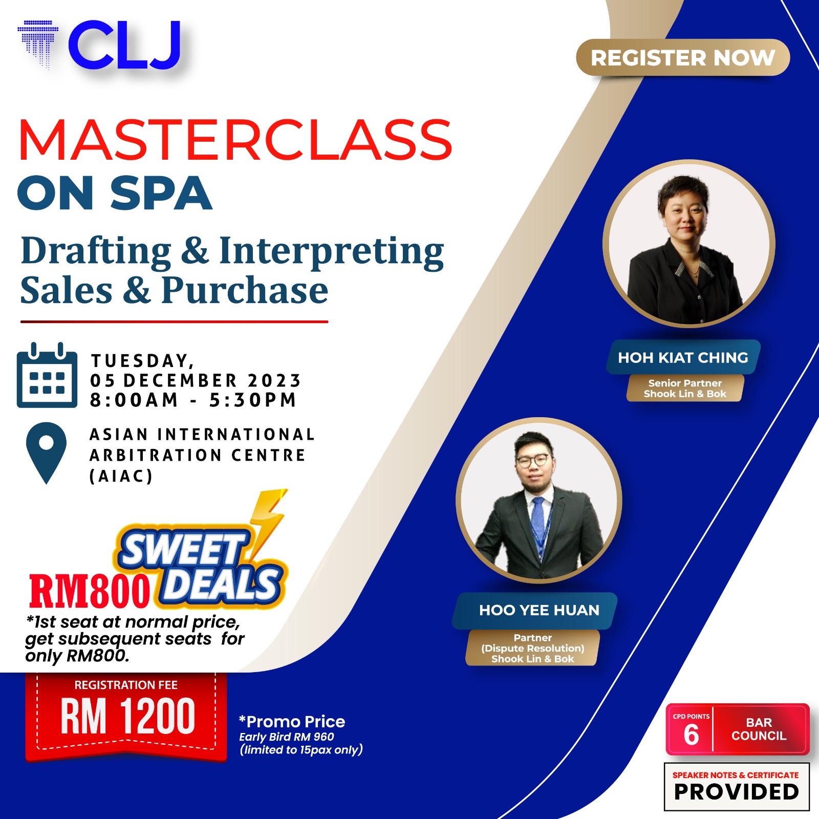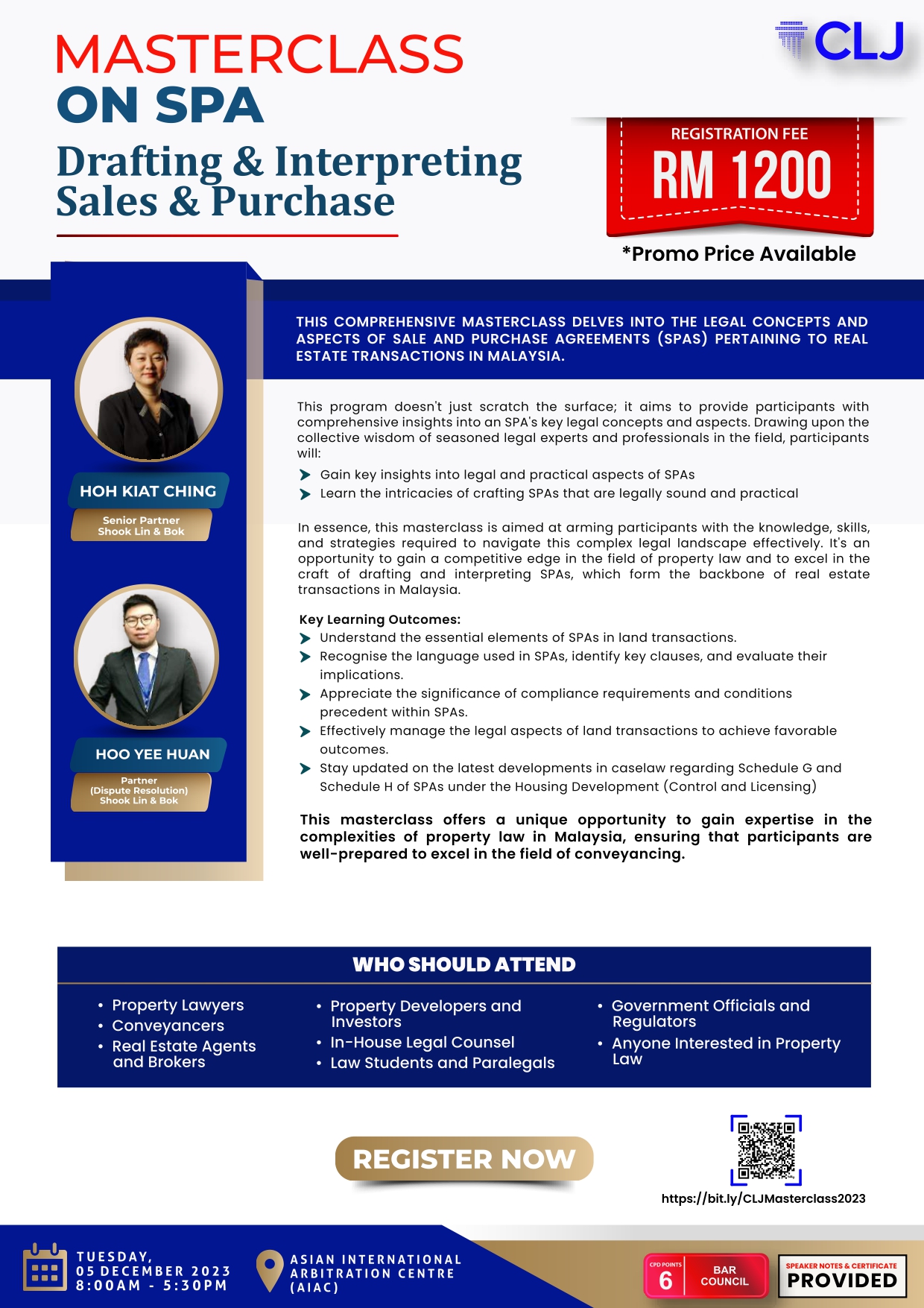 In essence, this masterclass is aimed at arming participants with the knowledge, skills, and strategies required to navigate this complex legal landscape effectively. It’s an opportunity to gain a competitive edge in the field of property law and to excel in the craft of drafting and interpreting SPAs, which form the backbone of real estate transactions in Malaysia.